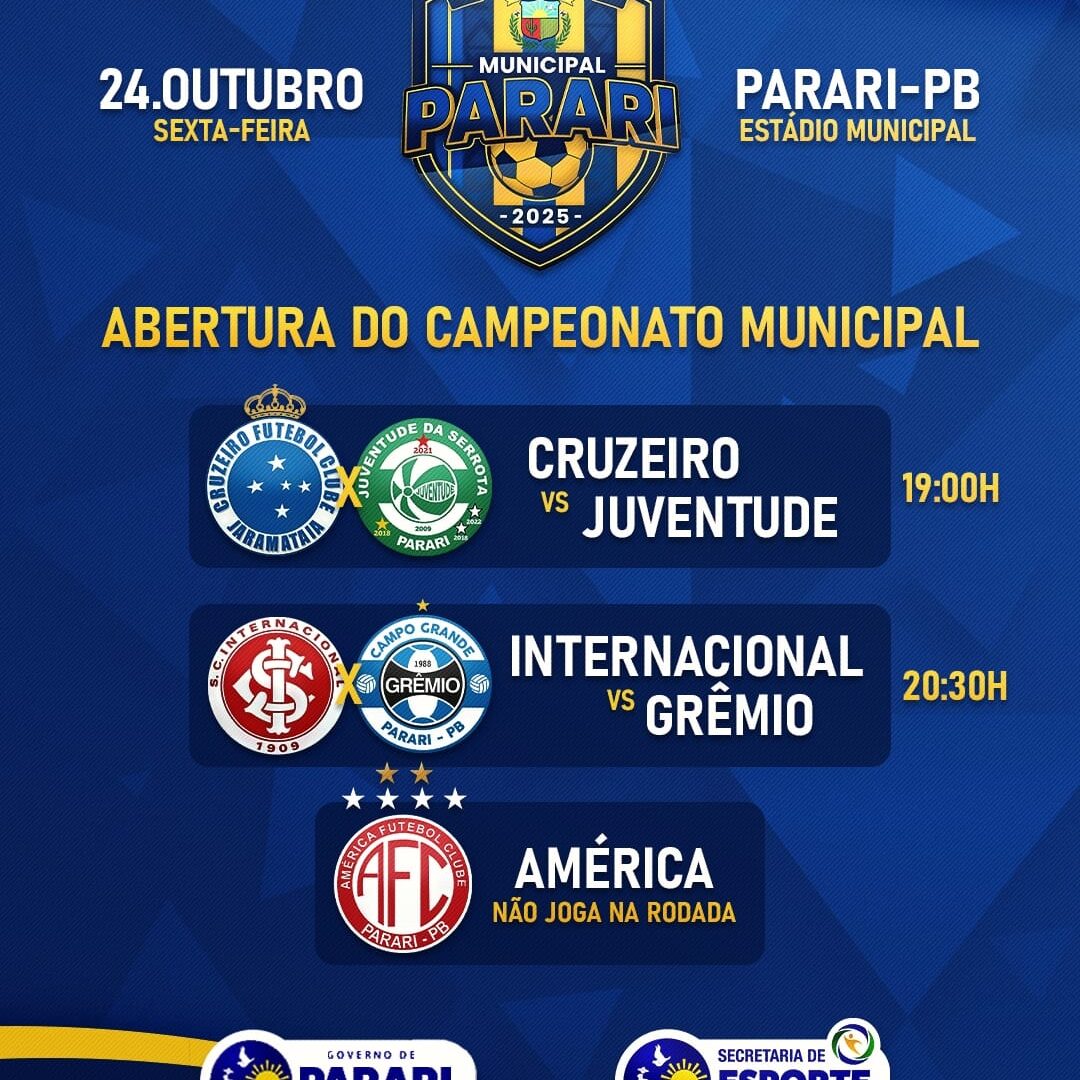 A Prefeitura de Parari, por meio da Secretaria de Esportes, realiza nesta sexta-feira, 24 de outubro, a abertura oficial do Campeonato Municipal de Futebol 2025, no Estádio Municipal. O evento promete reunir atletas, torcedores e desportistas em uma grande celebração do esporte local.