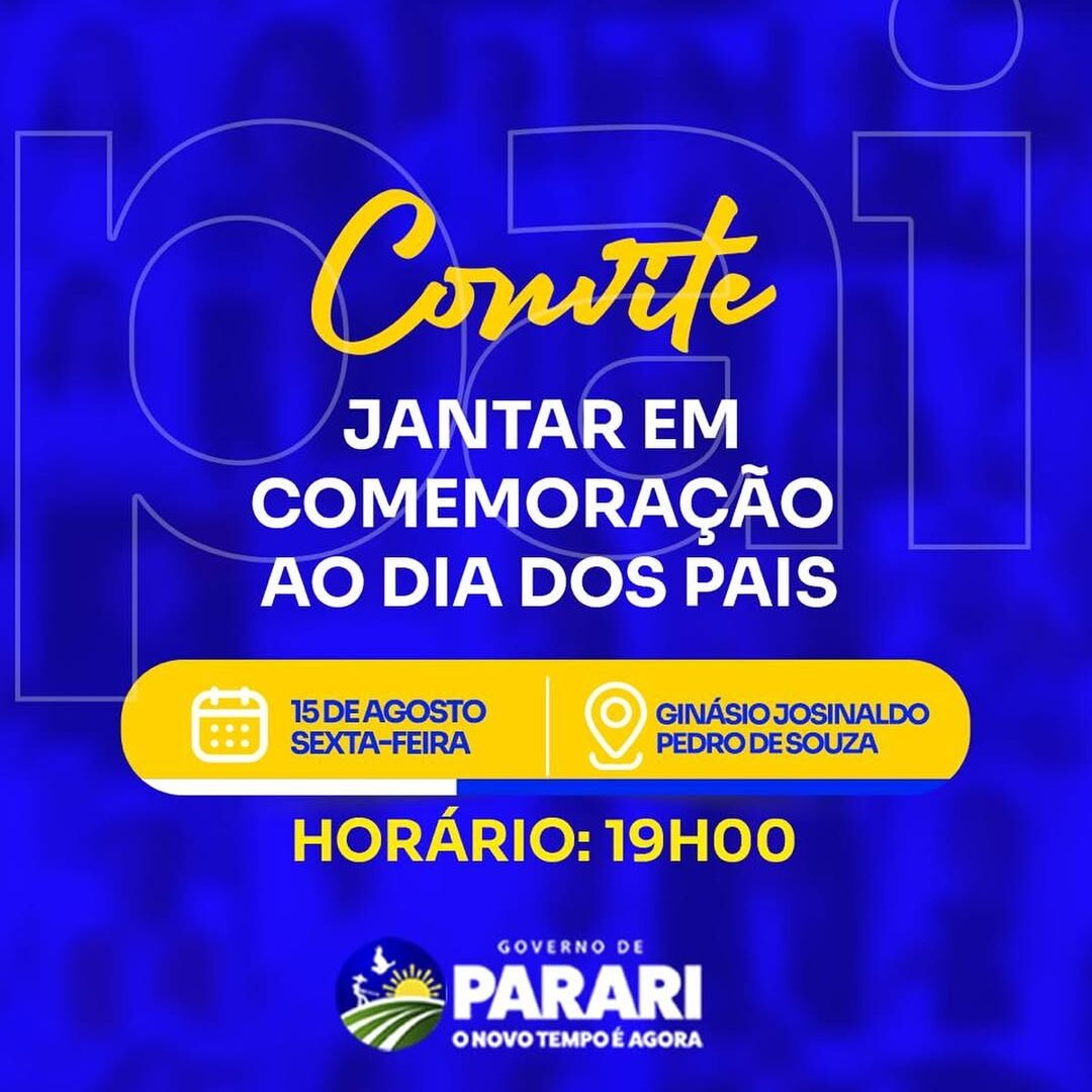 A Prefeitura Municipal de Parari está preparando uma noite especial em homenagem a todos os pais do município. A celebração acontecerá nesta sexta-feira (15/08), no Ginásio Josinaldo Pedro de Souza, a partir das 19h, reunindo famílias para comemorar.