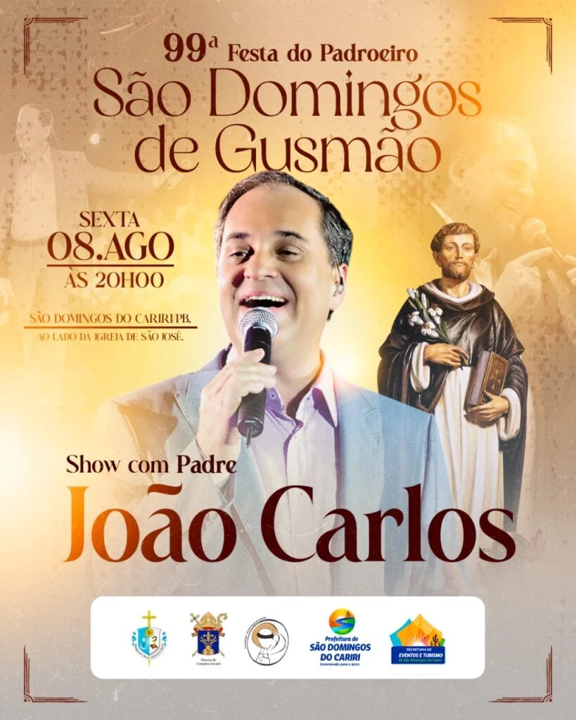 “É com muita alegria que anunciamos o show de Padre João Carlos, um dos maiores nomes da música católica do Brasil. Esse momento será especial não apenas para a fé do nosso povo, mas também para a cultura e a história de São Domingos do Cariri, que se prepara para comemorar 99 anos de devoção e união.”