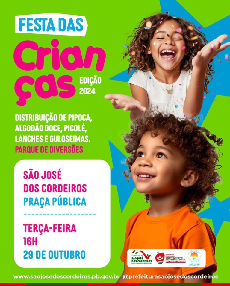 A Prefeitura de São José dos Cordeiros, através da Secretaria Municipal de Desenvolvimento e Assistência Social, convida todas as crianças para uma super festa em comemoração ao ‘Dia Das Crianças’.