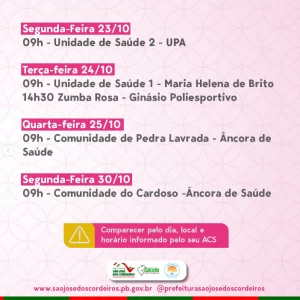A Prefeitura de São José dos Cordeiros, através da Secretaria Municipal de Saúde (SMS), divulga o cronograma das ações em prol do “Outubro Rosa”, mês da prevenção ao câncer de mama.