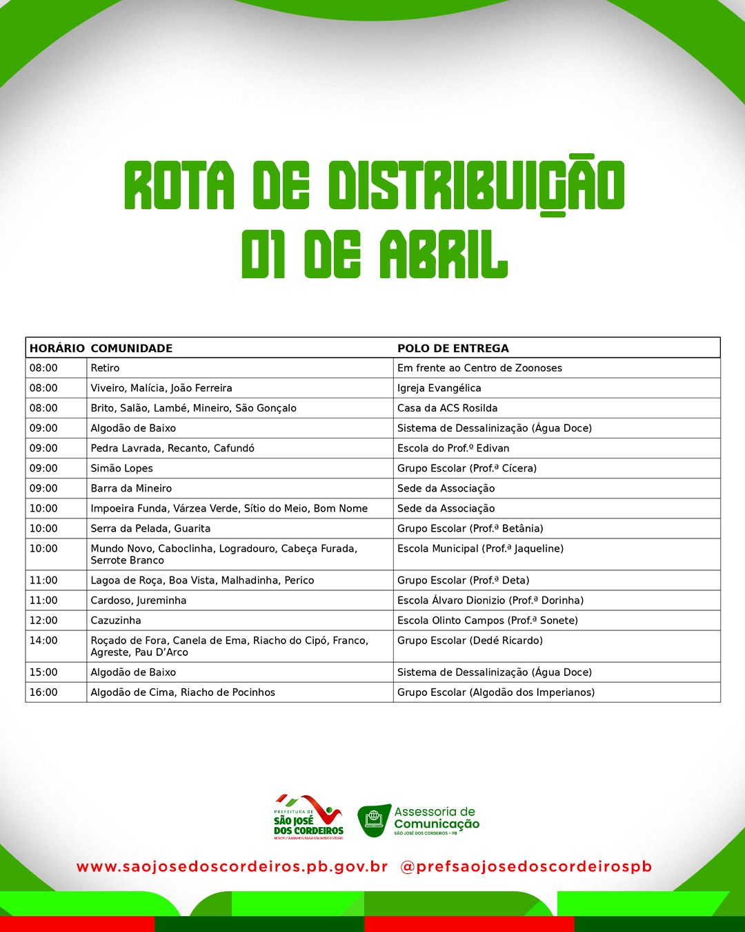 De acordo com o cronograma divulgado, a distribuição na zona urbana acontece na tarde desta terça-feira, garantindo que as famílias já possam se preparar para o período da Semana Santa com o alimento assegurado. Já na quarta-feira, dia 1º de abril, as equipes da Secretaria percorrerão todas as comunidades rurais do município, realizando a entrega diretamente aos beneficiários.