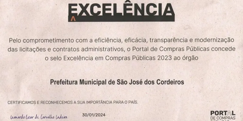 A gestão municipal de São José dos Cordeiros recebeu neste semana mais uma grande conquista, desta vez o portal de Compras Públicas concedeu a Prefeitura de São José dos Cordeiros o Certificado de Excelência em Compras Públicas, referente ao ano de 2023.