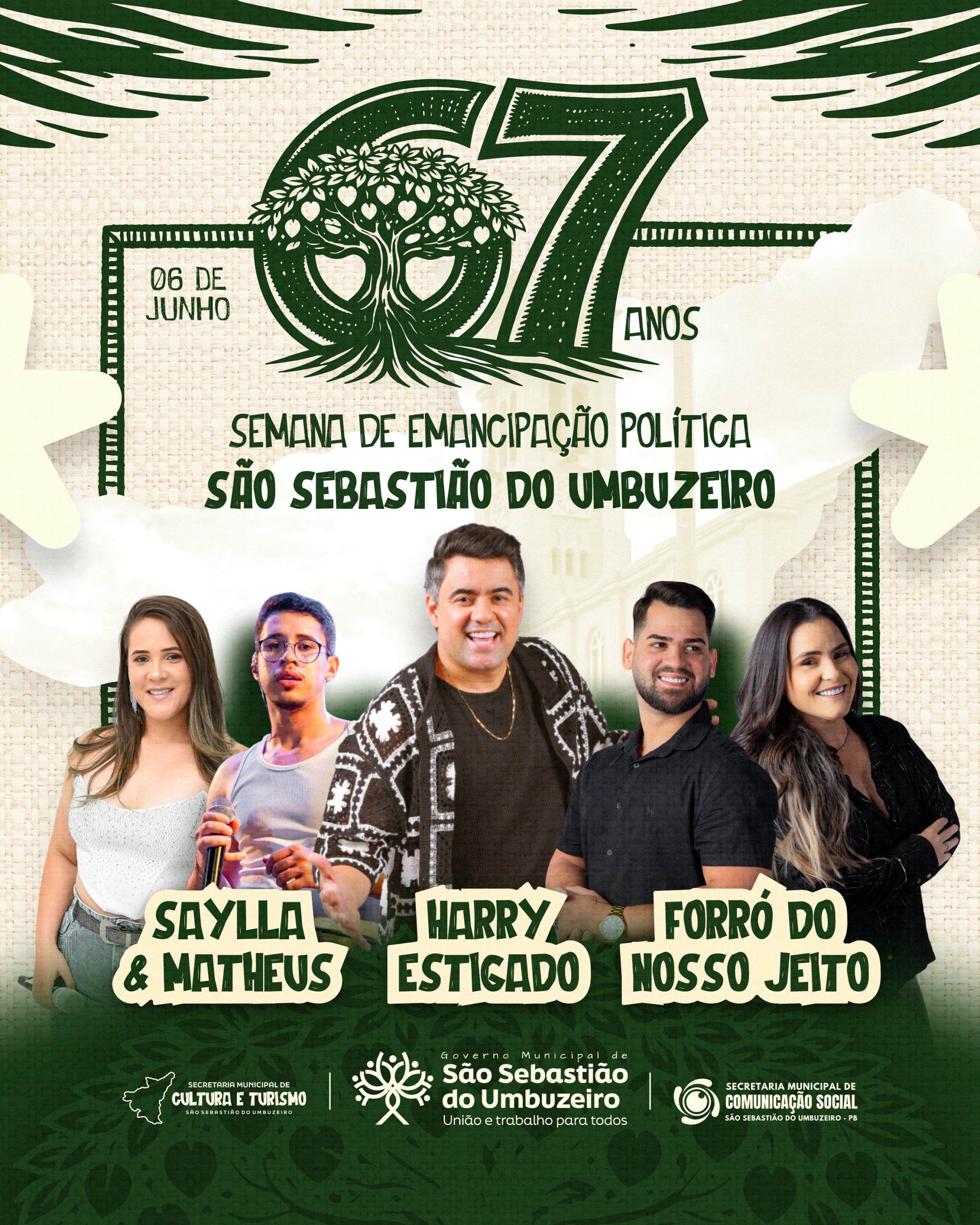 De acordo com o material divulgado, as festividades acontecerão no dia 6 de junho e contarão com shows de Saylla & Matheus, Harry Estigado e Forró do Nosso Jeito, atrações que prometem movimentar a cidade e atrair público da região.