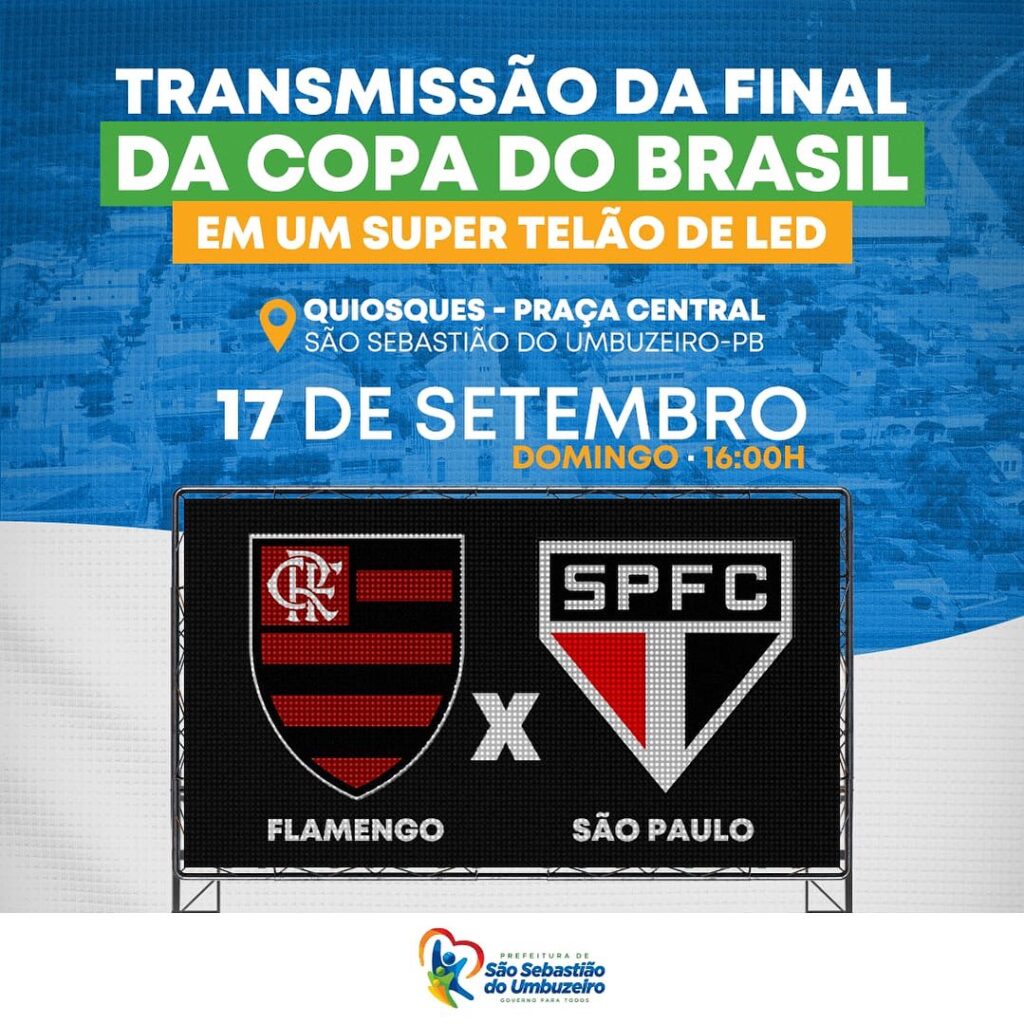 O super telão de led será instalado na Quiosque da Praça Central, no centro da cidade, e a expectativa é de reunir um grande número de torcedores flamenguistas e são-paulinos umbuzeirenses que torcem pelas equipes do Flamengo e São Paulo.