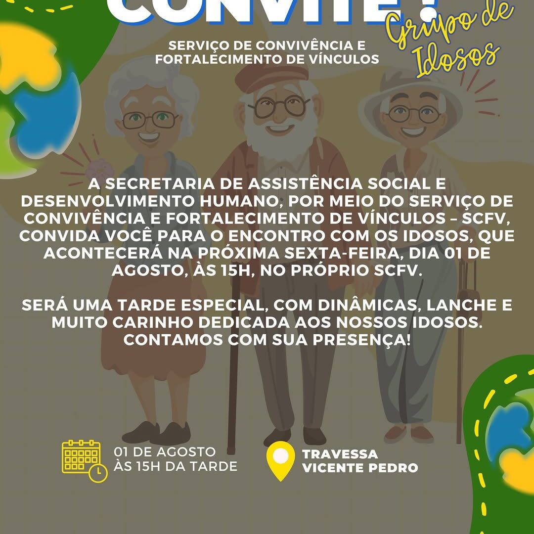 O evento será realizado às 15h, na sede do SCFV, localizada na Travessa Vicente Pedro, e tem como objetivo promover um momento de acolhimento, afeto e socialização entre os participantes.