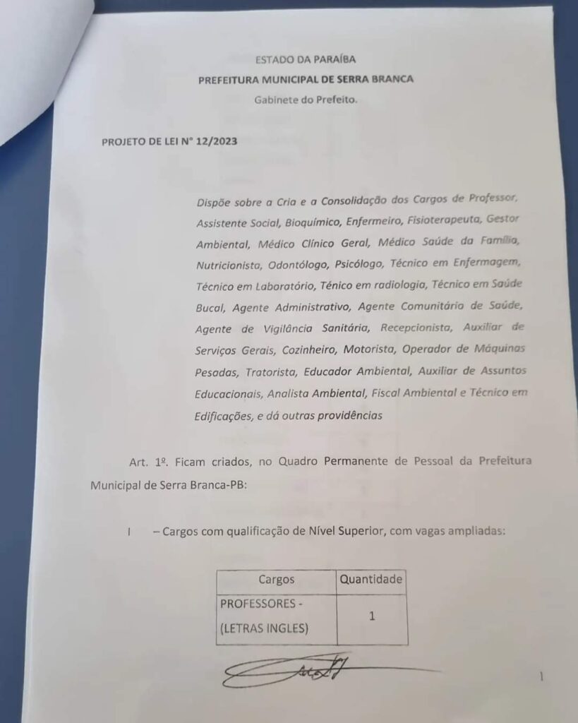 A Prefeitura de Serra Branca enviou à Câmara Municipal o projeto de Lei 12/2023, que tem o objetivo de ajustar os cargos para a realização do concurso público do município.