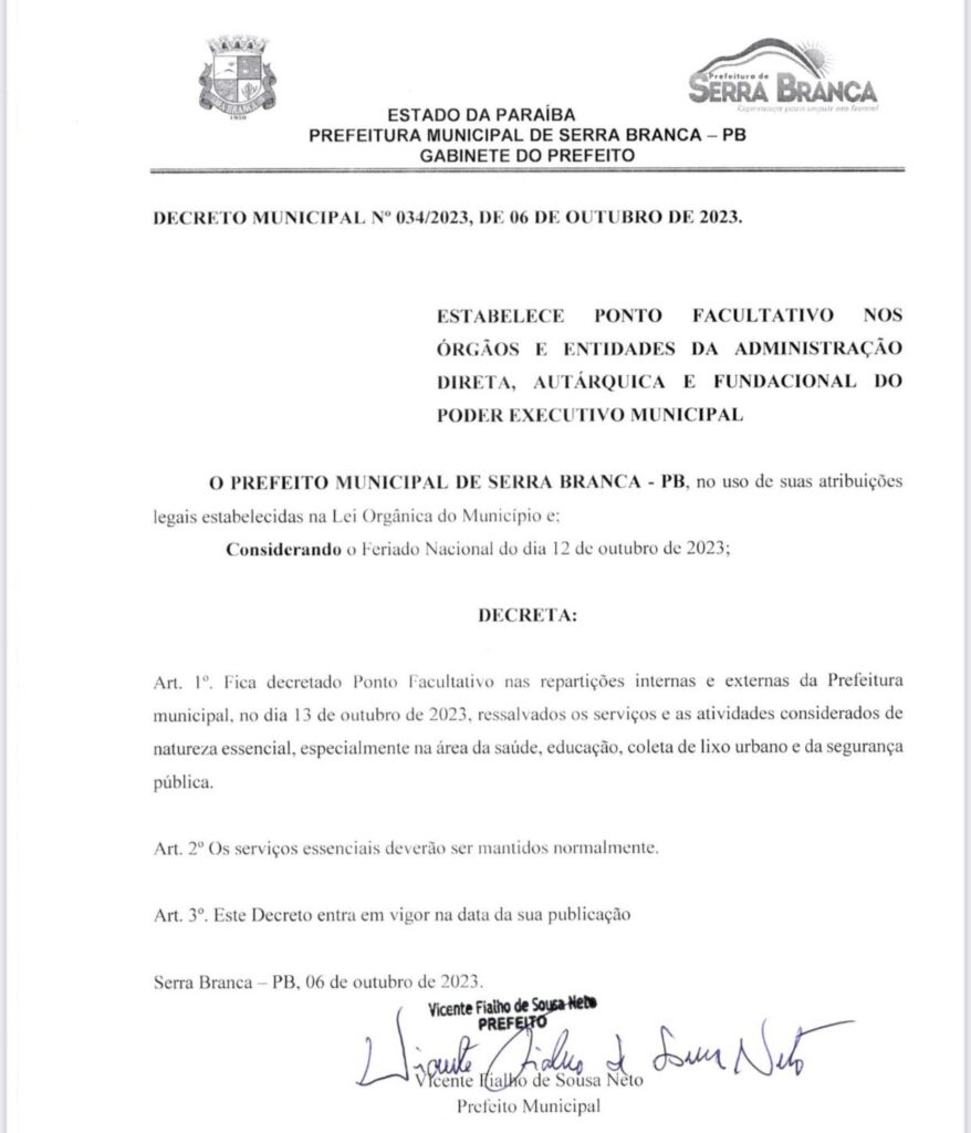 Em decreto municipal publicado nesta última sexta-feira (06) do Diário Oficial do Município, a Prefeitura de Serra Branca, através da Chefia de Gabinete do Município, decretou ponto facultativo no próximo dia 13 de outubro (sexta-feira), um dia após o feriado de 12 de outubro, dia consagrado à Nossa Senhora Aparecida, padroeira do Brasil. A determinação vale para os servidores municipais de repartições públicas da Administração Direta e Indireta do Município de Serra Branca.