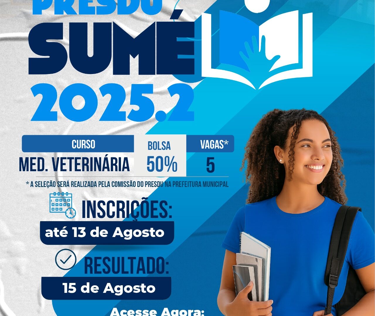 A Prefeitura de Sumé, em parceria com a Faculdade do Cariri paraibano – UNICIR, lança nesta quinta-feira (07) o Programa Municipal de Educação Superior para Todos – PRESDU, por meio do Edital nº 01/2025, que oferta bolsas de estudo de 50% para o curso de Medicina Veterinária, no turno noturno, com duração de 5 anos.