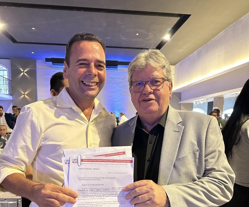 O presidente da Associação dos Municípios do Cariri e Agreste Paraibano e prefeito de São João do Tigre, Márcio Leite, entregou nas mãos do governador João Azevêdo, várias demandas encaminhadas pelos prefeitos e prefeitas da região do Cariri paraibano. Márcio Leite esteve reunido com João em almoço nesta segunda-feira (13), na Capital.