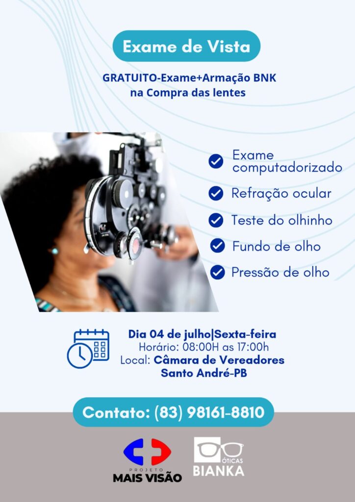 A população de Santo André terá a oportunidade de cuidar da saúde ocular com mais facilidade. No próximo dia 04 de julho, uma sexta-feira, será realizada uma ação do Projeto Mais Visão, em parceria com as Óticas Bianka, oferecendo exames de vista gratuitos na Câmara de Vereadores do município, das 08h às 17h.