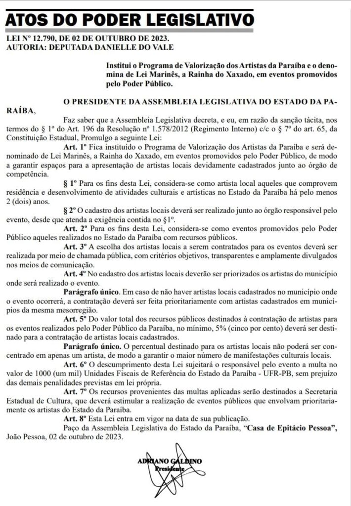 Foi publicada na edição desta terça-feira (03) do Diário Oficial do Estado (DOE) a lei que institui o programa de valorização dos artistas da Paraíba. A lei, denominada de ‘Marinês’, tem como um dos objetivos garantir a apresentação de artistas locais devidamente cadastrados junto aos órgãos de competência em eventos públicos na Paraíba.