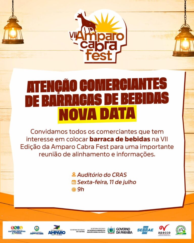 A Prefeitura de Amparo informa que a reunião de alinhamento com os comerciantes interessados em montar barracas de bebidas durante a VII edição da Amparo Cabra Fest teve a data alterada.