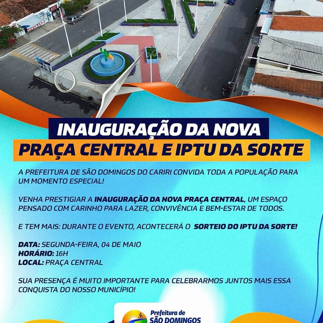 A Prefeitura de São Domingos do Cariri realiza, na próxima segunda-feira, 04 de maio, a inauguração da nova Praça Central do município. O evento está marcado para as 16h e acontecerá no próprio espaço, reunindo autoridades e população em um momento voltado à celebração de mais uma obra pública.