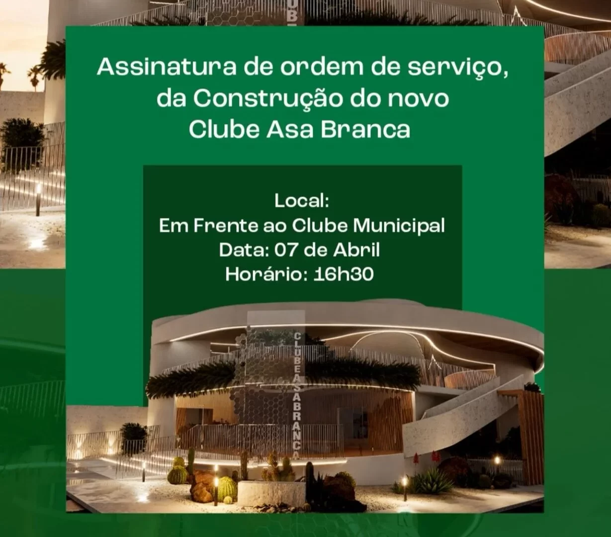 O município de São José dos Cordeiros vive a expectativa de um dos seus momentos mais emblemáticos na gestão pública recente. Na nesta terça-feira (07) de abril, às 16h30, o Governo Municipal realizará o ato oficial de assinatura da Ordem de Serviço para a construção do Novo Clube Asa Branca. A cerimônia acontecerá em frente ao antigo prédio do clube municipal.