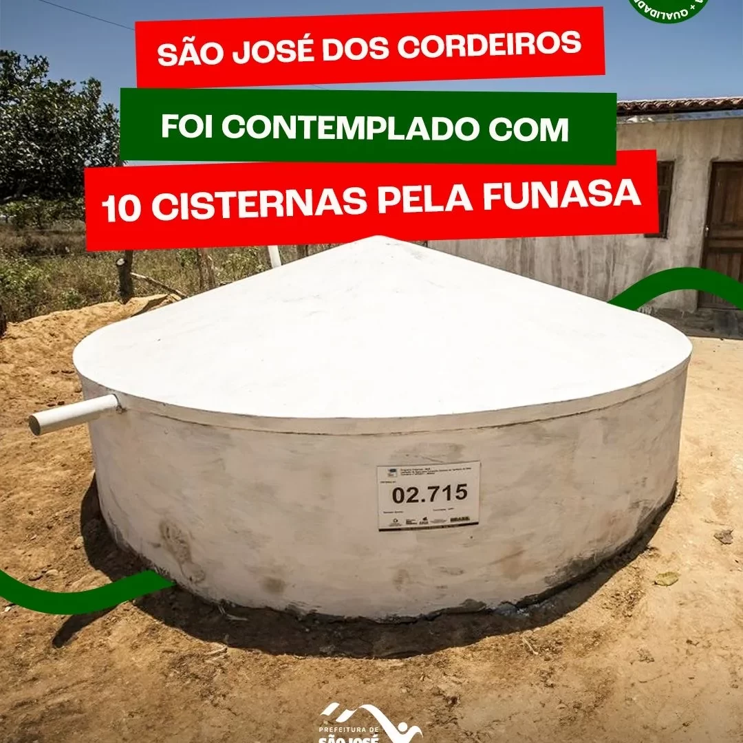 O município de São José dos Cordeiros foi contemplado com a implantação de 10 cisternas por meio da Fundação Nacional de Saúde (Funasa). Os equipamentos são destinados ao sistema de captação e armazenamento de água da chuva para consumo humano e têm como objetivo ampliar o acesso à água potável para famílias da zona rural que ainda não dispõem de abastecimento regular.