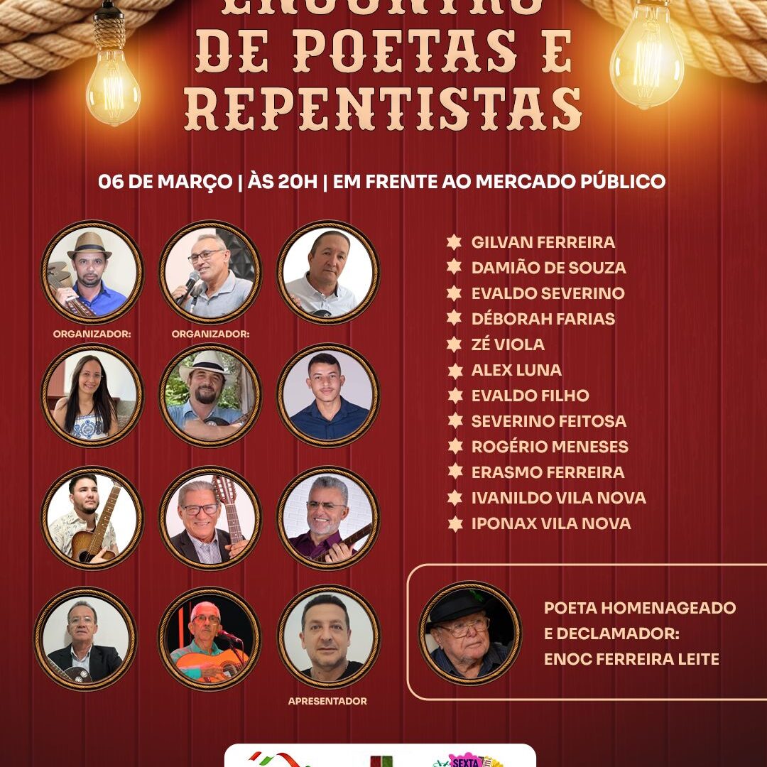 A Prefeitura Municipal de São José dos Cordeiros realiza, na próxima sexta-feira, 06 de março, um dos maiores eventos culturais do município: o Encontro de Poetas e Repentistas, que acontecerá a partir das 20h, na praça em frente ao Mercado Público.