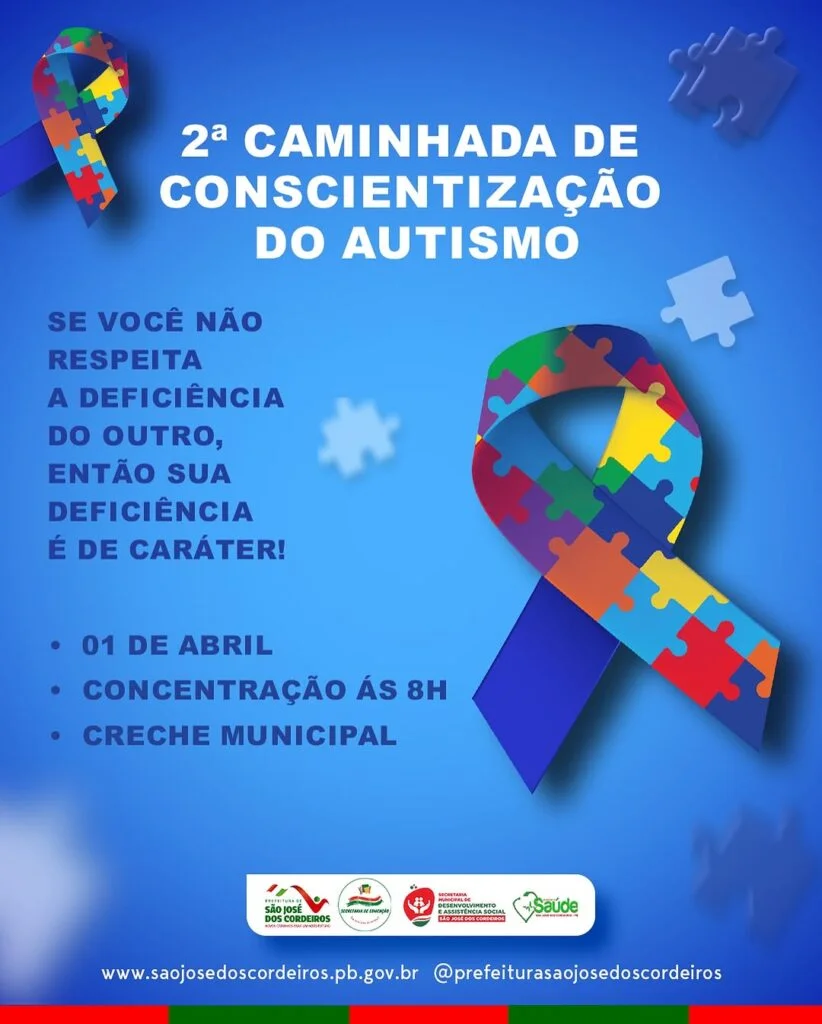 Nesta terça-feira, 1° de abril, a cidade de São José dos Cordeiros será palco da 2ª Caminhada de Conscientização sobre o Autismo, promovida pela Prefeitura Municipal. O evento tem como objetivo ampliar o conhecimento da população sobre o Transtorno do Espectro Autista (TEA) e reforçar a importância da inclusão, do respeito e da aceitação das pessoas autistas na sociedade.