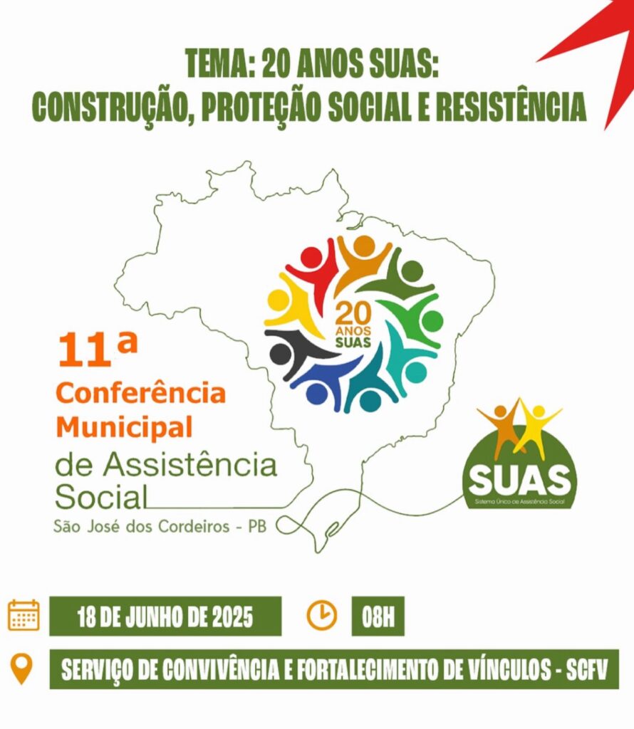 O município de São José dos Cordeiros realiza, no próximo dia 18 de junho, a 11ª Conferência Municipal de Assistência Social. O evento acontecerá a partir das 08h da manhã no Serviço de Convivência e Fortalecimento de Vínculos, reunindo representantes do poder público, trabalhadores do SUAS, usuários e sociedade civil para discutir os rumos da assistência social no município e no país.