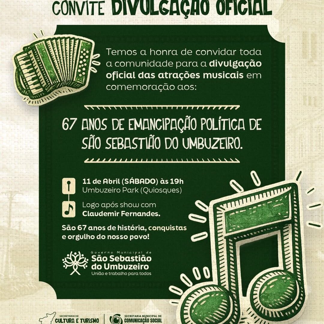 A Prefeitura de São Sebastião do Umbuzeiro convida toda a população para participar do lançamento oficial das atrações musicais em comemoração aos 67 anos de emancipação política do município.