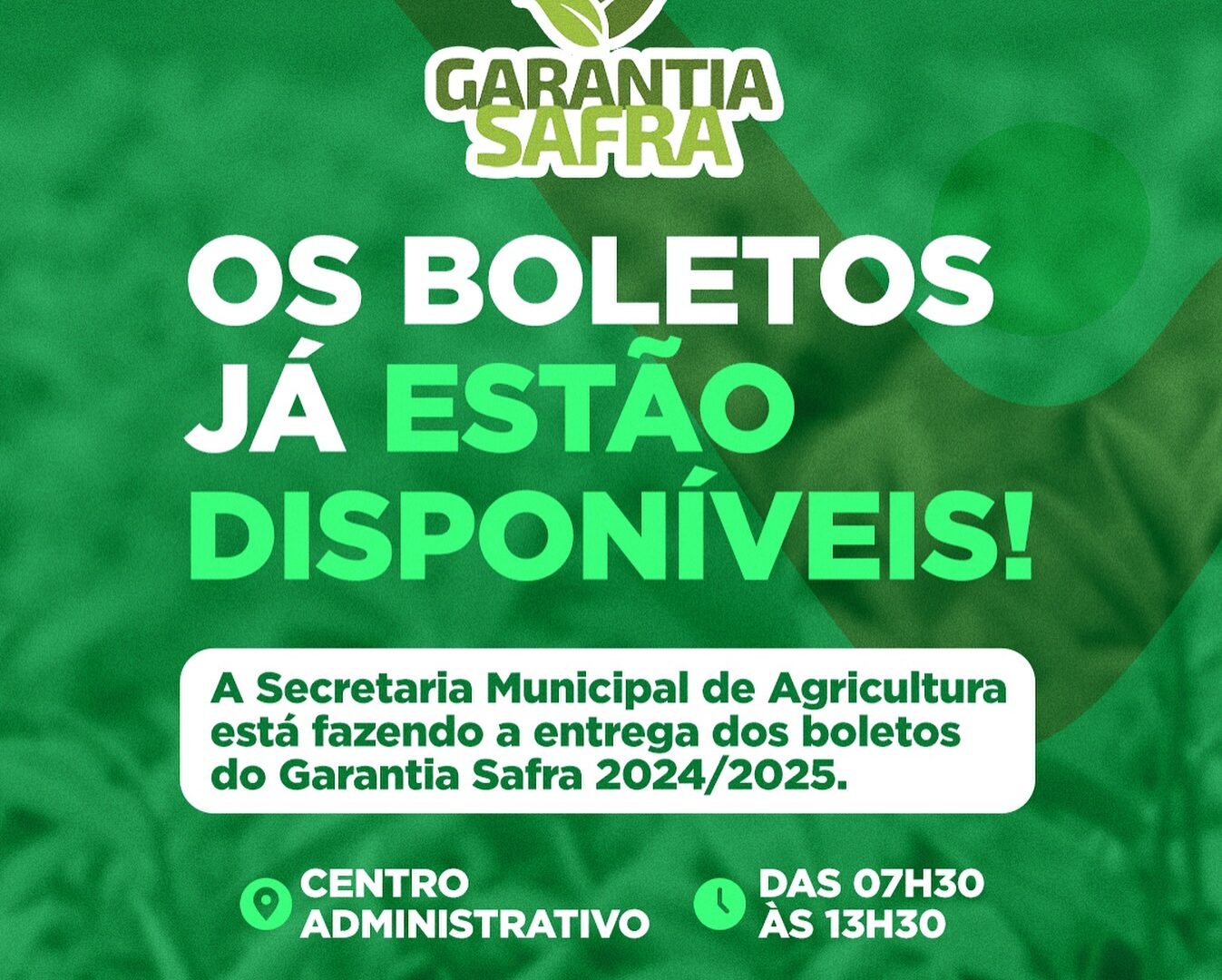 A prefeitura municipal de São José dos Cordeiros, através da Secretaria Municipal de Agricultura informa que já está realizando a entrega dos boletos do Garantia Safra, 2024/2025.Os beneficiários devem comparecer a Secretaria de Agricultura, Centro Administrativo, no horário das 07h30 às 13h30.