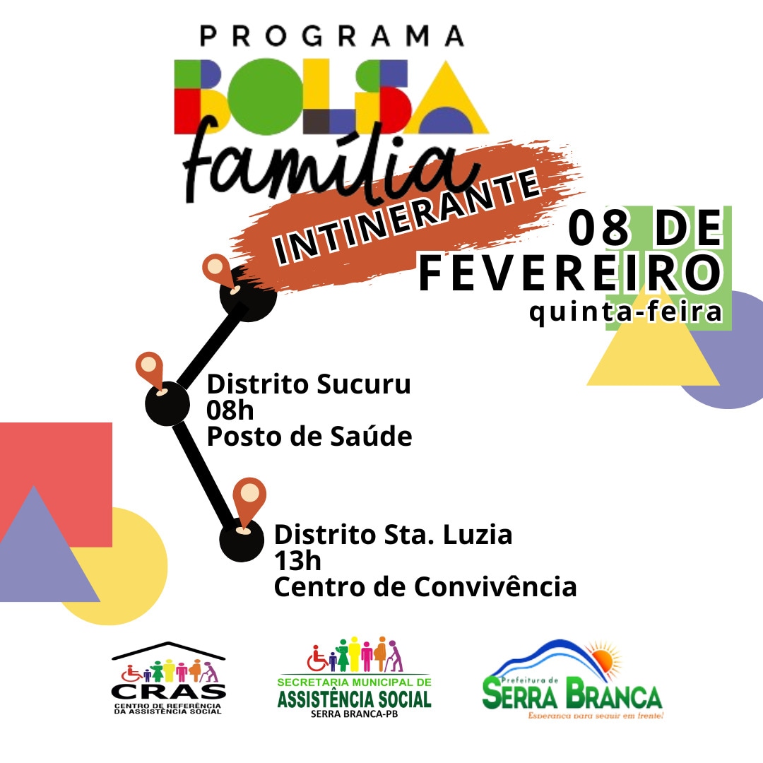 A Secretaria de Assistência Social de Serra Branca, estará fazendo uma programação especial nesta quinta-feira (08), voltada para os atendimentos do Programa Bolsa Família, nos Distritos de Santa Luzia do Cariri e Sucuru.