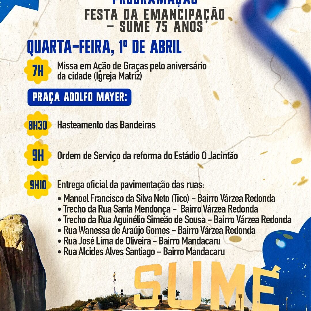 A Prefeitura de Sumé divulgou oficialmente a programação comemorativa pelos 75 anos de emancipação política do município. A agenda reúne solenidades que celebram a história e o desenvolvimento da cidade, valorização e tradições locais.