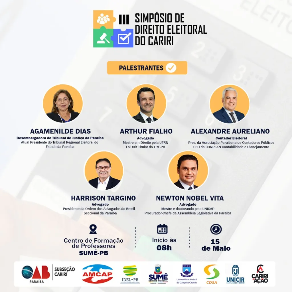 O município de Sumé sediará no dia 15 de maio no Centro de Formação dos Professores, o III Simpósio de Direito Eleitoral do Cariri paraibano, que reunirá renomados nomes do direito eleitoral paraibano.