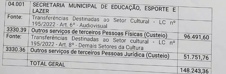 Art. 1º Fica aberto no orçamento vigente o crédito especial no valor de R$ 148.243,36 (cento e quarenta e oito mil duzentos e quarenta e três e reais e trinta e seis centavos), destinados ao esforço de dotação do orçamento público do município de Serra Branca-PB, vigente como segue, visando fomentar as ações que serão desenvolvidas no âmbito da Política Pública ligada ao segmento artístico cultural com dotações orçamentárias ligadas as ações contempladas pela Lei Federal Complementar de nº 195/2022, para instruir e dar celeridade e efetividade as ações, conforme dotação