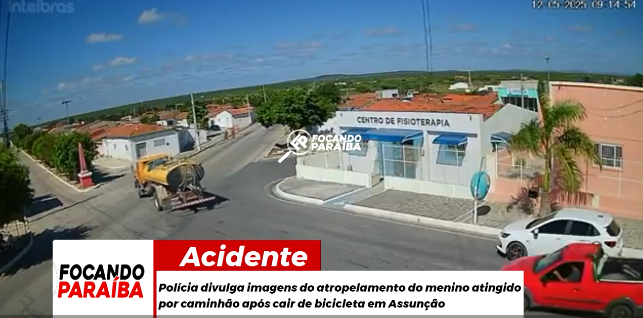 A Polícia Civil divulgou imagens da câmera que flagrou o atropelamento do menino João Lucas, de 9 anos. Ele se desequilibrou da bicicleta que pedalava e caiu embaixo do caminhão pipa que transitava em uma rua do município de Assunção, no Cariri da Paraíba, na manhã desta segunda-feira (12).