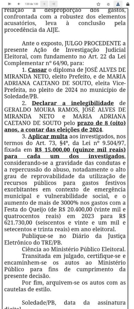 A Justiça Eleitoral da 23ª Zona de Soledade cassou o diploma do prefeito Miranda Neto e da vice Adriana Nirinha, declarando-os inelegíveis, ao lado do ex-prefeito Geraldo Moura Ramos, por oito anos. A decisão reconhece abuso de poder econômico em razão dos gastos milionários com a Festa do Queijo de 2024, que saltaram de pouco mais de R$ 20 mil em 2023 para R$ 621 mil em ano eleitoral, um aumento superior a 3.000%.